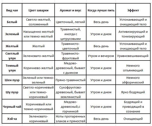 Однозначный ответ затруднителен, но с другой стороны, если понимать свои предпочтения во вкусе и нужном эффект - вполне реально подобрать для себя наилучший сорт. Ниже мы приводим сравнительную таблицу разных видов чая из Китая в контексте их характеристик и эффекта от употребления, которая точно поможет всем любителям китайского чая определиться с выбором.
