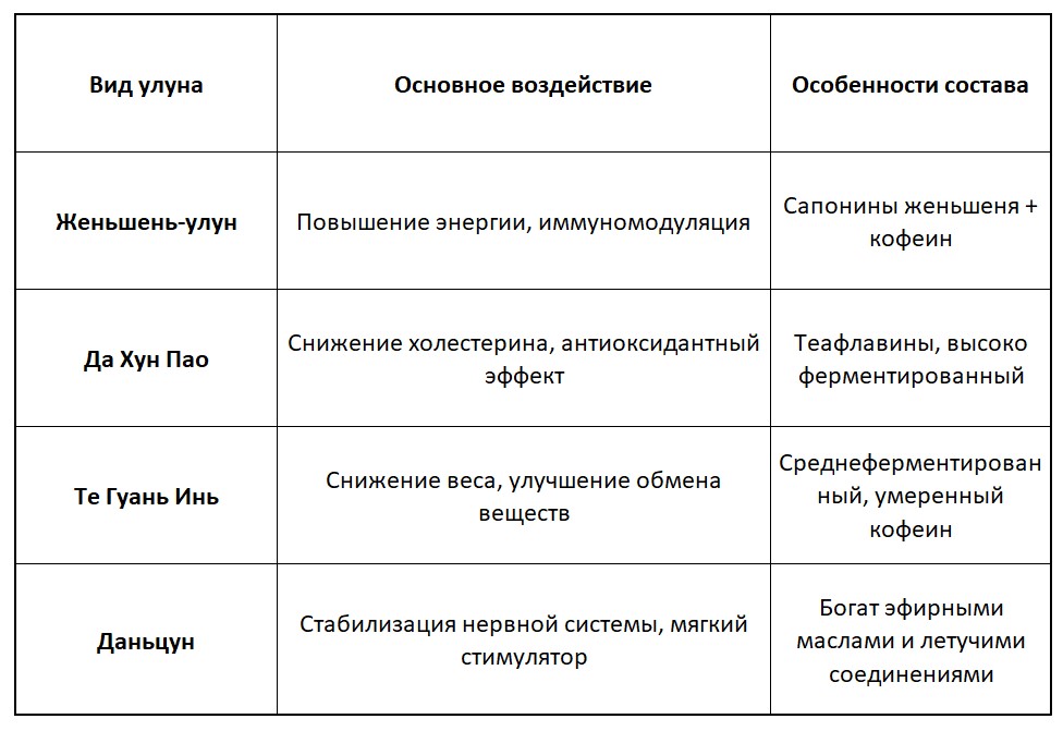 Основное воздействие на организм разных видов улуна: