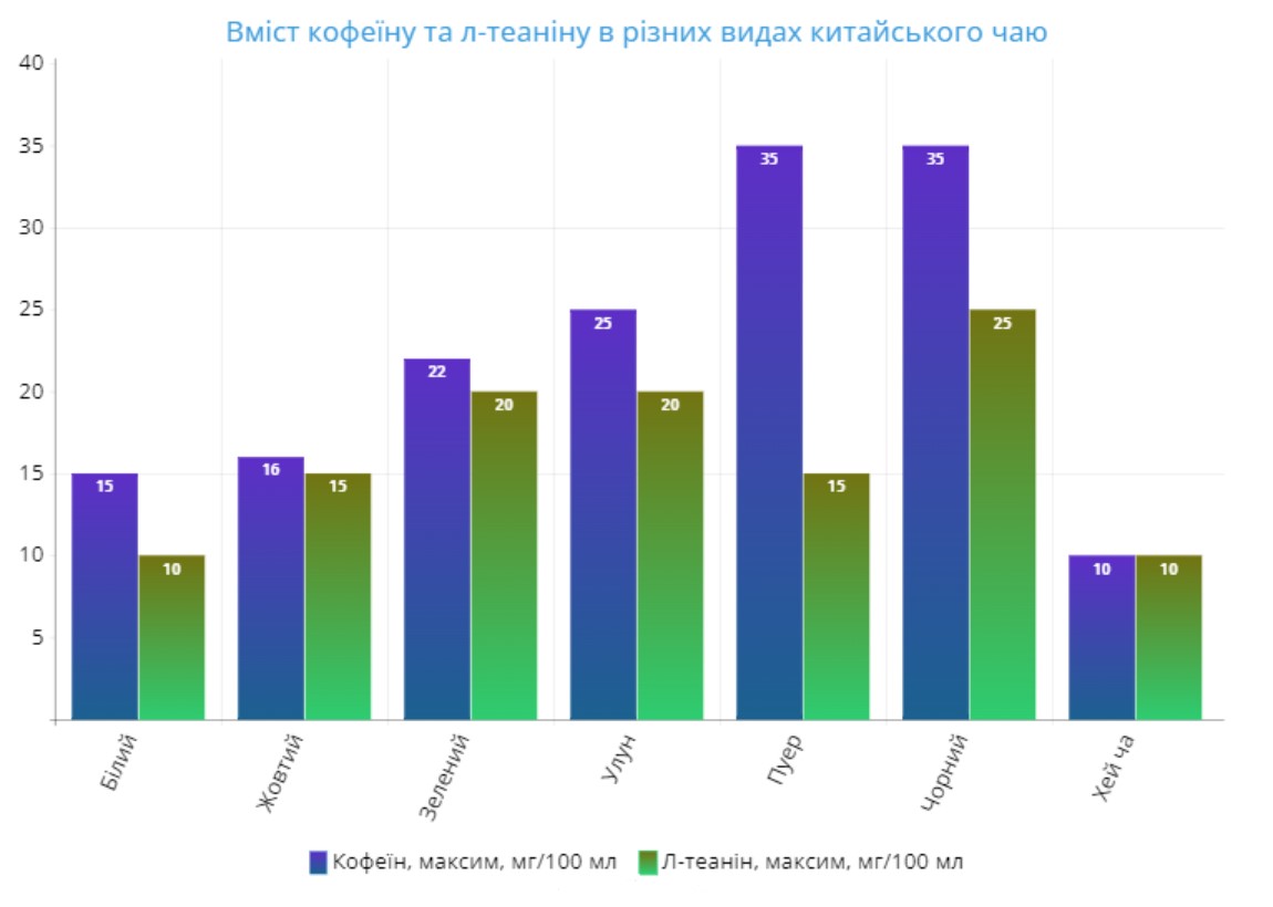 Як відрізняються різні види китайського чаю за вмістом кофеїну і л-теаніну?