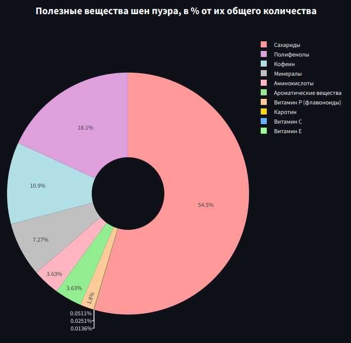Обильное количество таких полифенолов как катехинов - сильных антиоксидантов в данном чае, это залог его солидной пользы, а с другой стороны - он без кофеина (содержит похожее вещество теин) и это исключает жесткий возбуждающий эффект для парасимпатической нервной системы. Любой качественный шен пуэр очень полезен для организма, да и ума тоже. Он отлично очищает сосуды и организм в целом, отлично помогает при стрессовых ситуациях и нагрузках на нервную систему, хорошо подойдетт для программы детокса. Если нужно чтобы штырил - можно купить шен пуэр хорошей выдержки и качества и заваривать крепче обычного. Он также вызывает состояние умиротворения и легкой эйфории. хорошо влияет на переваривание еды и весь желудочно-кишечный тракт. Сопутствует похудению, снижает холестерин. В общем и целом - просто кладезь полезностей и приятностей, ниже представлена диаграмма полезных веществ шен пуэра в процентах от их суммарного количества.