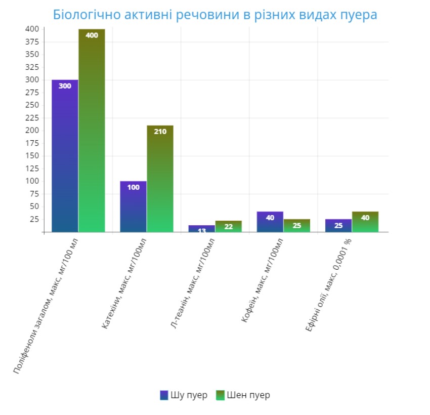 Нижче ми на базі багаторічних хімічних досліджень китайських НДІ чаю Пуер (що в місті Цзінхун), НДІ чаю Пуер міста Ліньцан і НДІ чаю Пуер міста Пуер зібрали повну порівняльну характеристику біологічно-активних хімічних речовин, які є у складі шу й шен пуерів, і показали, чим у цьому сенсі відрізняються ці два основні види.