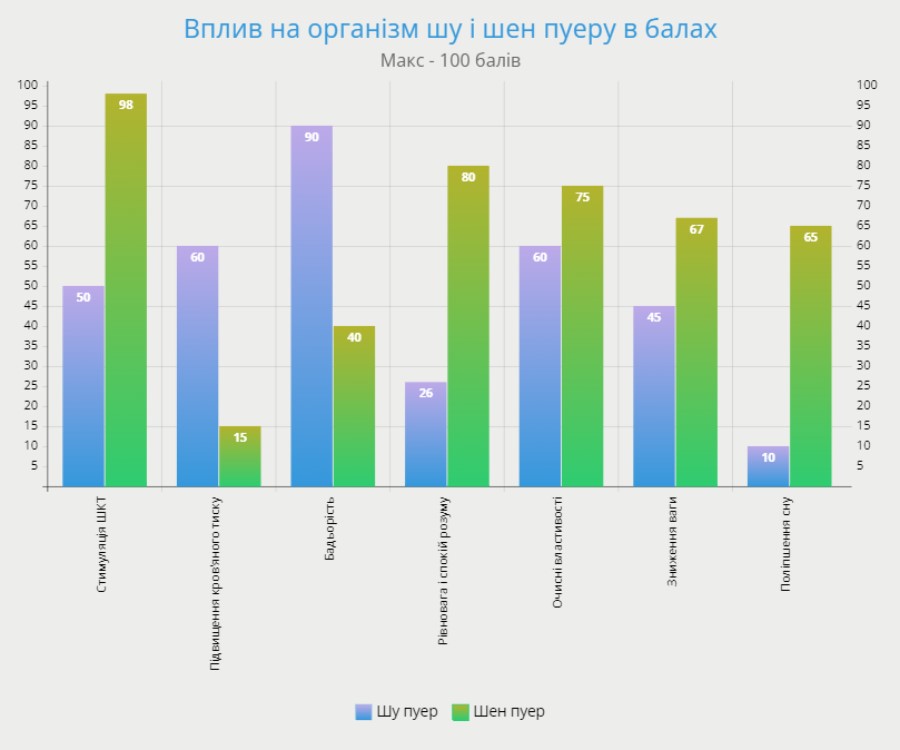 Загалом - впливають вони по різному. І цей момент слід враховувати під час вибору того чи іншого сорту, особливо якщо є якісь індивідуальні застереження в плані здоров'я конкретної людини. Провівши системний аналіз наукових досліджень ефекту від вживання різних пуерів, а також узагальнюючи наш власний досвід і досвід наших покупців, нижче ми представляємо діаграму, що показує, яким чином впливає шен і шу пуер на організм людини.