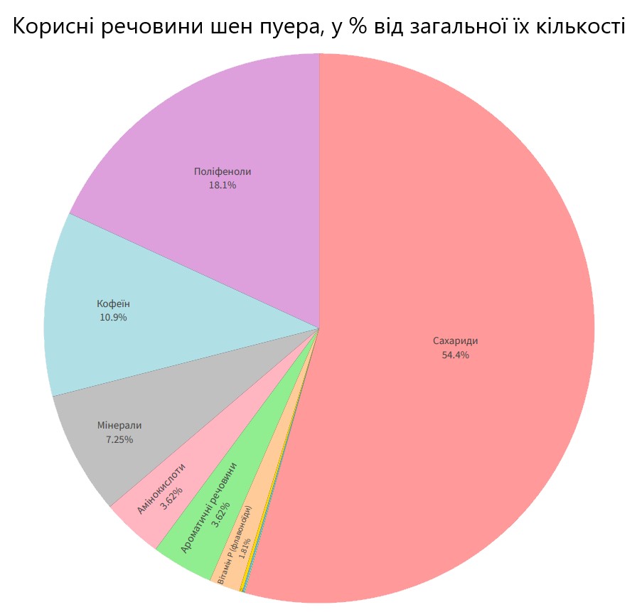 Велика кількість таких видів поліфенолів як катехіни - сильних антиоксидантів у даному чаї, це запорука його солідної користі, а з іншого боку – він без кофеїну (містить схожу речовину теїн) і це виключає жорсткий збуджуючий ефект для парасимпатичної нервової системи. Будь-який шен пуер дуже корисний для організму, та й розуму теж. Він відмінно очищає судини і організм в цілому, відмінно допомагає при стресових ситуаціях і навантаженнях на нервову систему, добре підійде для системи детоксу. Якщо потрібно щоб штирив - можна купити шен пуер хорошої витримки та якості і заварювати міцніше звичайного. Він також викликає стан умиротворення і легкої ейфорії, добре впливає на перетравлення їжі та весь шлунково-кишковий тракт. Спонукає до схуднення, знижує холестерин. Загалом - просто джерело корисності та приємності. Загалом і загалом - просто джерело корисних і приємних речей, нижче представлена діаграма корисних речовин шен пуеру у відсотках від їхньої сумарної кількості.