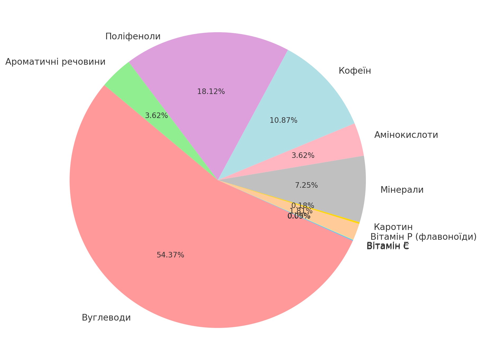 Нижче представляємо діаграму з усіма корисними речовинами, що входять до складу шу пуеру у відсотках від загальної кількості таких речовин.
