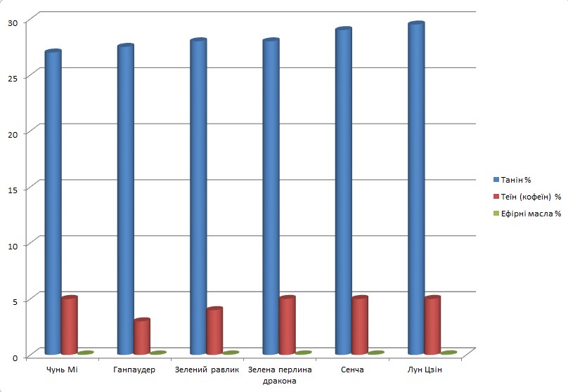 Найцінніше в зеленому чаї - це його розчинні речовини, що впливають на смак і аромат готового напою. Для правильного вибору і купівлі саме підходящого вам чаю, є сенс ознайомитися з відмінностями в хімічному складі його різних сортів. Виявляється, різні сорти зеленого чаю відрізняються за складом і кількістю таких речовин. Нижче ми наводимо діаграму кількості таніну, теїну й ароматичних олій у найпопулярніших сортах зеленого чаю.